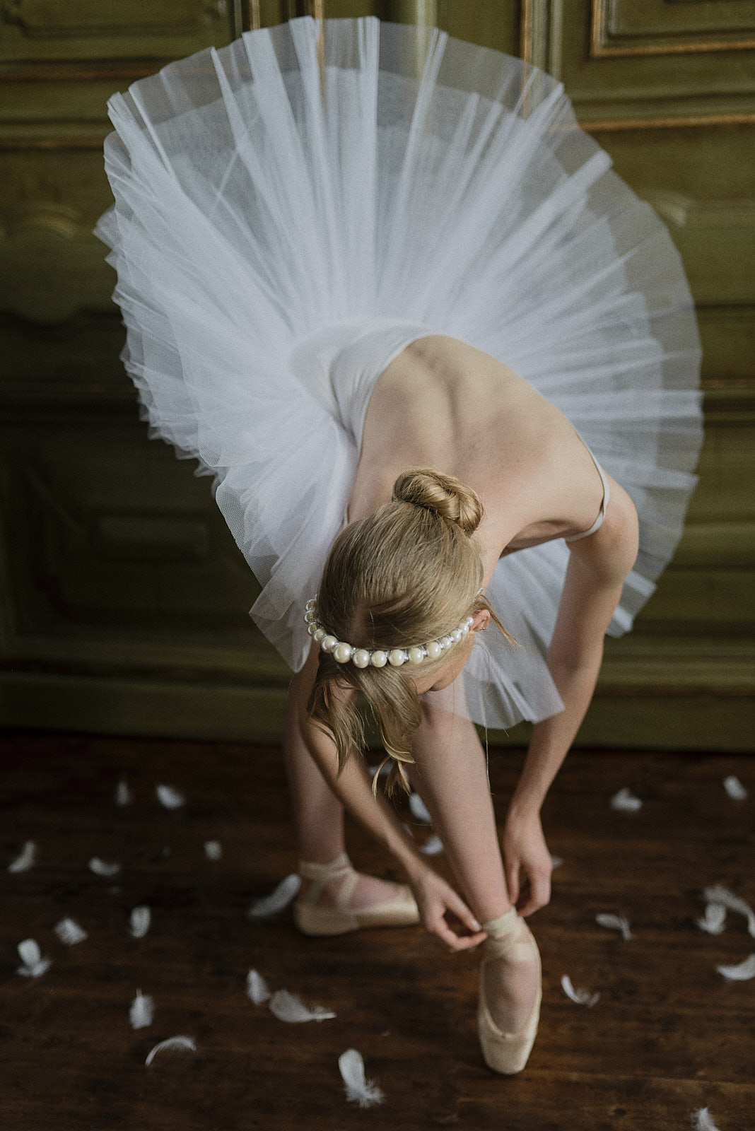 As we embrace the ballet-inspired theme, nosotros have styled the helpmate in a archetype ballet flat bun. This was achieved by loosely sweeping back her hair into in a detailed depression twist bun. With this understated look, the bride styles her hair with one of her luxurious crowns. Equally she starts to permit loose and dances freely in her silk gown and short black feathered gown, her bun comes out and instead she flaunts a messy ponytail. To match her pearl crown, the bride is covered in an extravagantly long veil by designer Alin Le' Kal, which is beautifully adorned with white pearl embellishments.