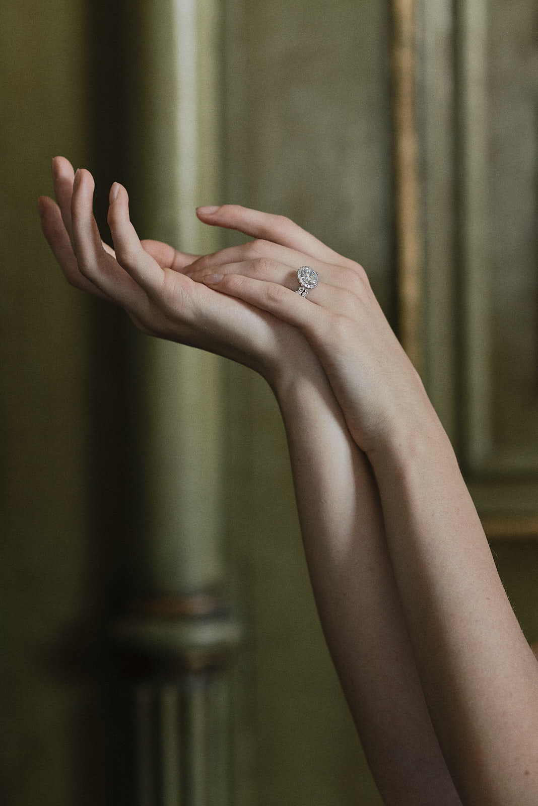 The luxury hymeneals ring is a modern interpretation, featuring a thin band filled diamonds. This ring is designed to fit perfectly under the magnificent halo design date ring. As the bride changes into the pink feathered silk gown, she removes her diamond floral earrings, and replaces it with striking statement floral earring design. She dances throughout the day in range of different sparkling bracelets. When the lord's day sets, she changes to a dark evening look to embrace the blackness swan. For this evening await, the bride wears a black argument ring and drib earrings, perfectly friction match the mood of the final black feathered gown.