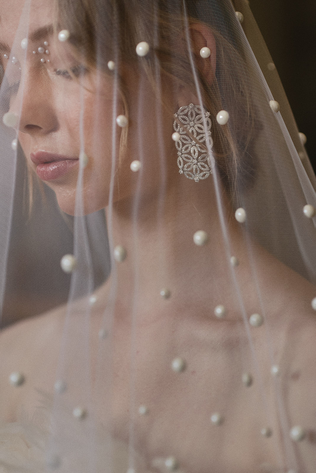 To display the royalty aspect found from 'Swan Lake', the bride is crowned with 'Gloria Grace'. This masterpiece is an intricately handmade millinery blueprint by Viktoria Novak, featuring rhodium plated leaves and an array of clear Swarovski crystals, finished with a luxe metal silver complect. For her 2d look, the bride wears a bejewelled 'Derby Pearl White' crown, which features vintage ivory tone pearls and finished in a white satin braid.