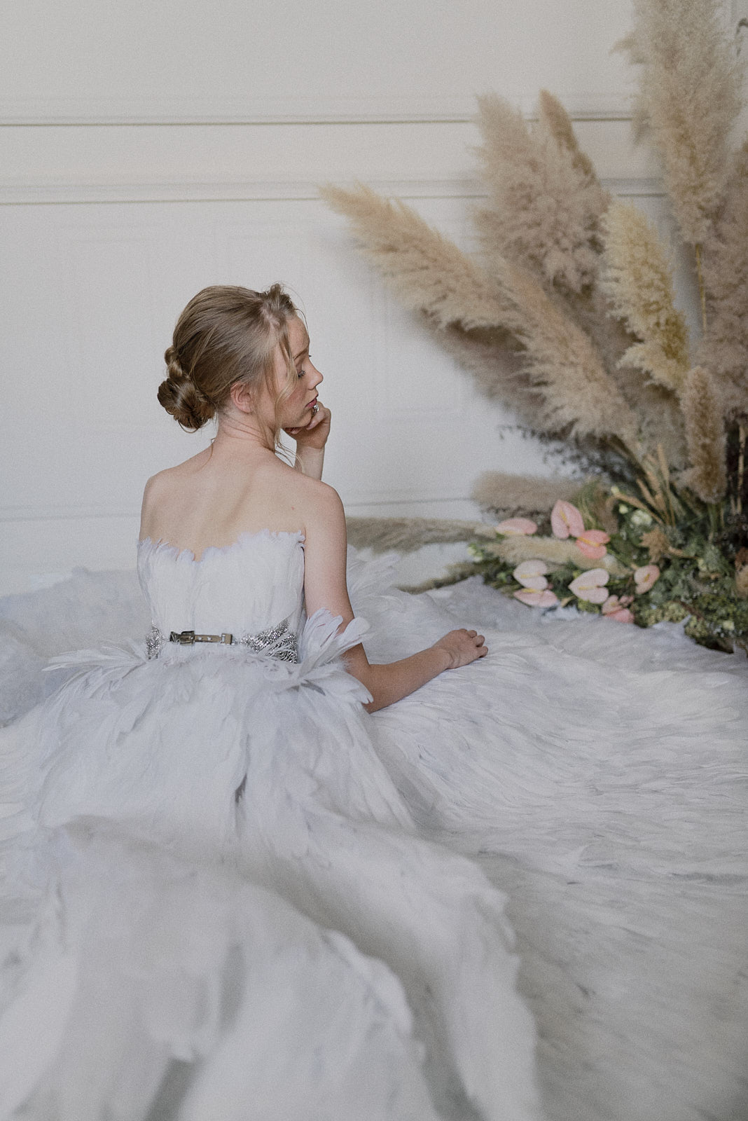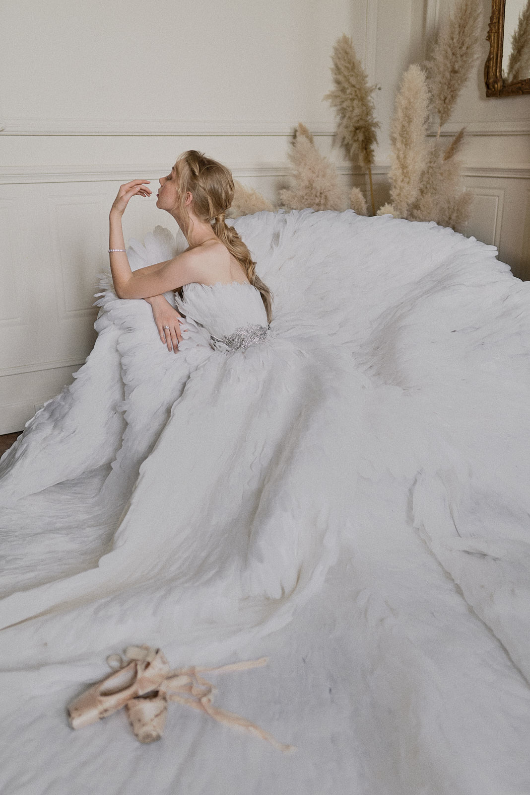 This bridal style shoot takes inspiration from the timeless 'Swan Lake' ballet to create a unique, creative and luxurious wedding theme. The bride is styled with couture feathered gowns direct off the Paris Mode Show runway, with iii contrasting designs by celebrity designer Alin Le' Kal. These awe-inspiring gowns were styled with a range of exquisite jewellery, designer shoes, millinery and loftier-style dazzler styles.